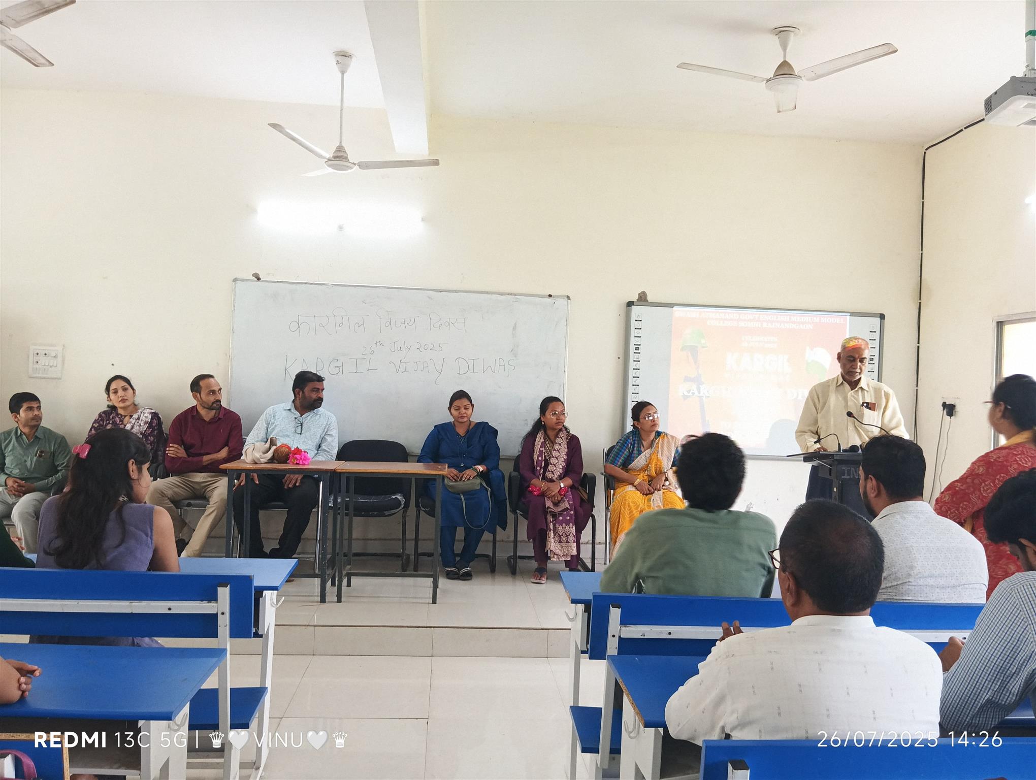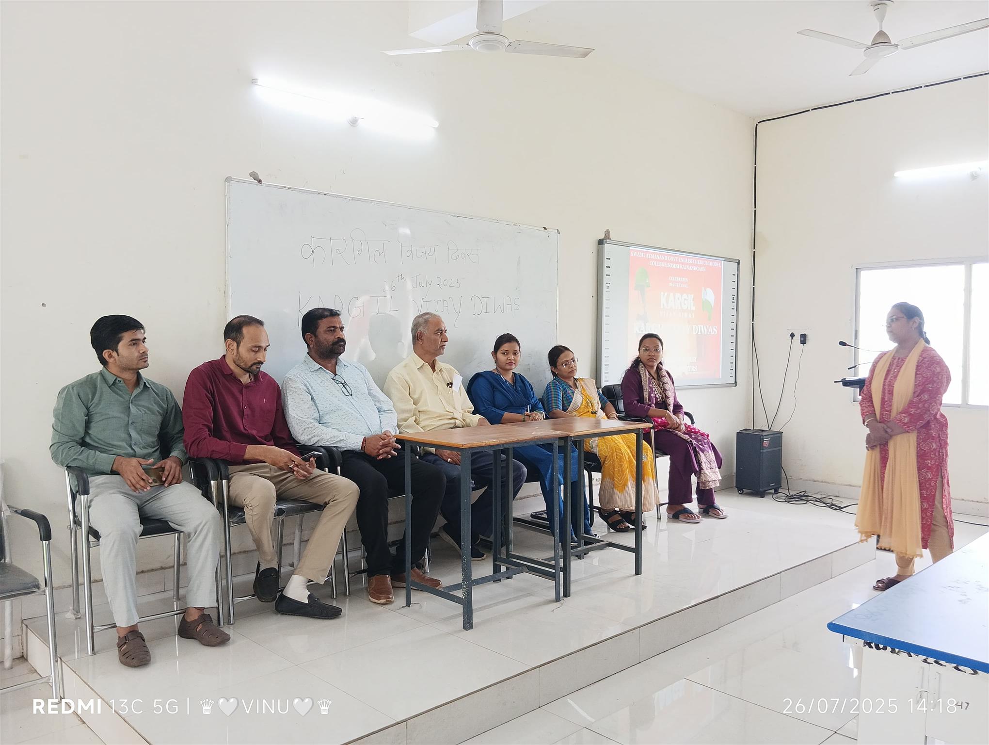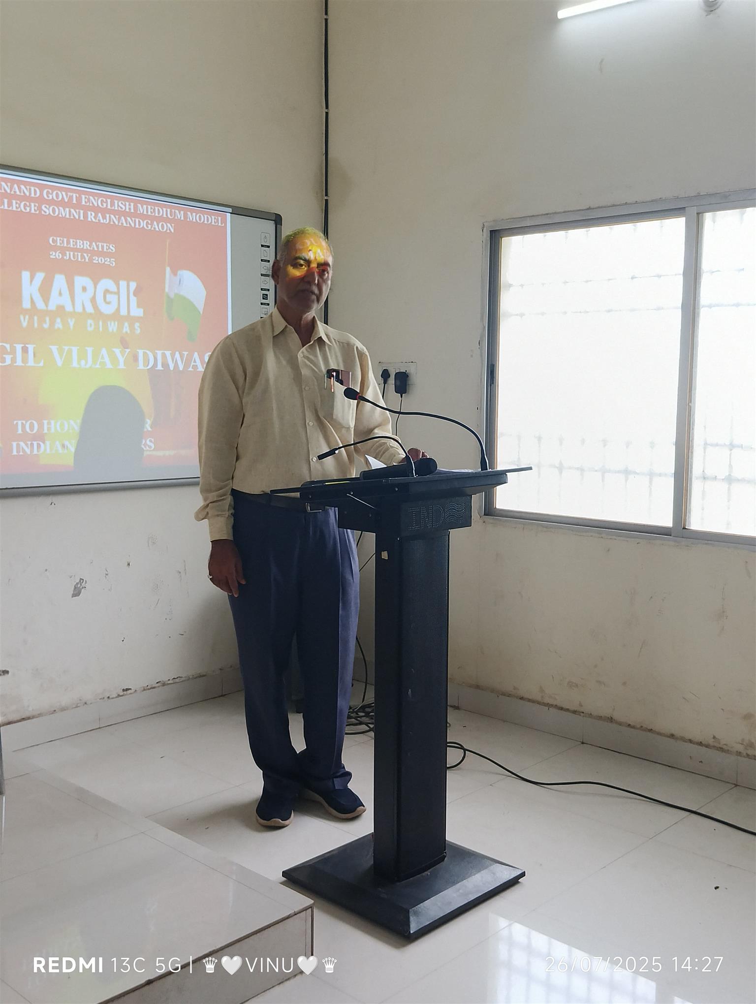 26 जुलाई, शनिवार को स्वामी आत्मानंद शासकीय अंग्रेज़ी माध्यम आदर्श महाविद्यालय, सोमनी में कारगिल विजय दिवस मनाया गया। कार्यक्रम की शुरुआत सरस्वती वंदना से हुई। प्राचार्य डॉ. अनिल कश्यप ने कारगिल युद्ध के वीर श्री साजन दुबे को शॉल और नारियल देकर सम्मानित किया। संचालन डॉ. राधिका सरकार ने किया। श्री सौरभ साहू ने रामधारी सिंह दिनकर की प्रसिद्ध कविता "परशुराम की प्रतीक्षा" का ओजपूर्ण पाठ किया। प्राचार्य डॉ. कश्यप ने अपने उद्बोधन में कारगिल युद्ध की परिस्थितियों और भारतीय सैनिकों की वीरता पर प्रकाश डाला। इसके बाद श्री साजन दुबे ने अपने युद्धकालीन अनुभव साझा किए, जिससे वातावरण भावुक हो गया।कार्यक्रम में सहायक प्राध्यापक सुश्री निकिता शाह, श्रीमती त्रिवेणी साहू तथा श्री मुस्तफा अंसारी उपस्थित रहे। इस अवसर पर श्री कश्यप राठौर ने युद्ध के दौरान शहीद वीर सैनिक मनोज पांडेय जी द्वारा अपने भाई को लिखा गया एक भावुक पत्र पढ़ा। अंत में श्री कश्यप ने सभी का आभार व्यक्त कर कार्यक्रम का समापन किया।