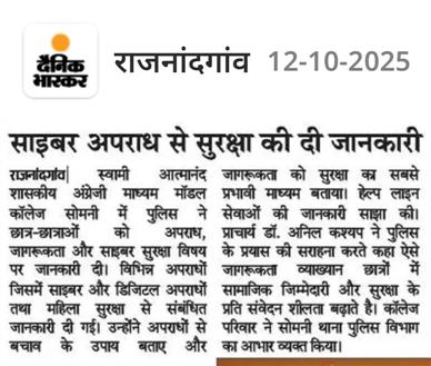 स्वामी आत्मानंद शासकीय अंग्रेज़ी माध्यम मॉडल कॉलेज, सोमनी में सोमनी थाना के पुलिस अधिकारियों द्वारा छात्र-छात्राओं को अपराध, जागरूकता एवं साइबर सुरक्षा विषय पर व्याख्यान एवं मार्गदर्शन प्रदान किया गया।